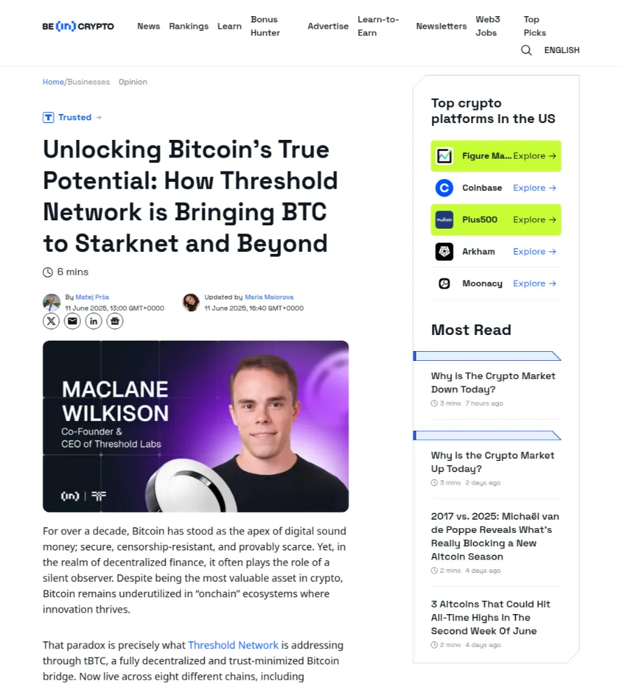 Proactive Media Outreach: With a sharp narrative in hand, we launched a full-scale media outreach campaign. This included drafting a high-impact press release titled “tBTC Launches on Starknet: Expanding Bitcoin’s Role in Multi-Chain DeFi” and distributing it via crypto newswires and direct contacts. We personally pitched the story to top crypto and fintech journalists, tailoring angles for each outlet, from the technical breakthrough angle for developer-focused media to the market opportunity angle for mainstream crypto news. We offered interviews with tBTC’s founders and prepared insightful quotes to make journalists’ jobs easier. Additionally, we leveraged The PR Genius’s network to secure thought leadership opportunities around the launch: placing tBTC spokespeople on podcasts, arranging event speaking slots, and contributing guest articles to discuss Bitcoin’s evolving role in DeFi. All of these efforts ensured that our narrative was not only distributed widely but also reinforced through expert voices in the community.